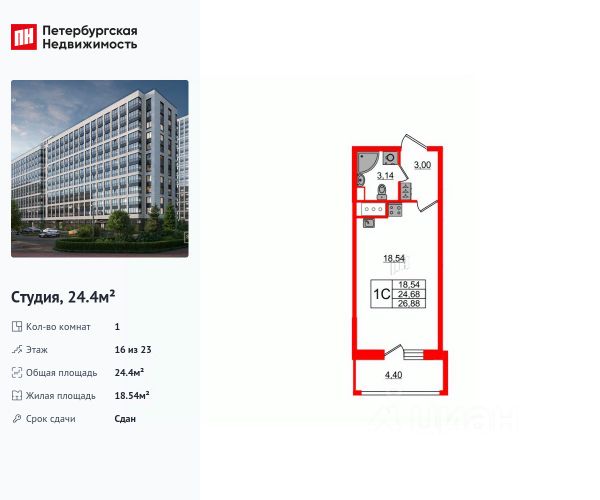 Студия, 24.4 м², 16/23 этаж