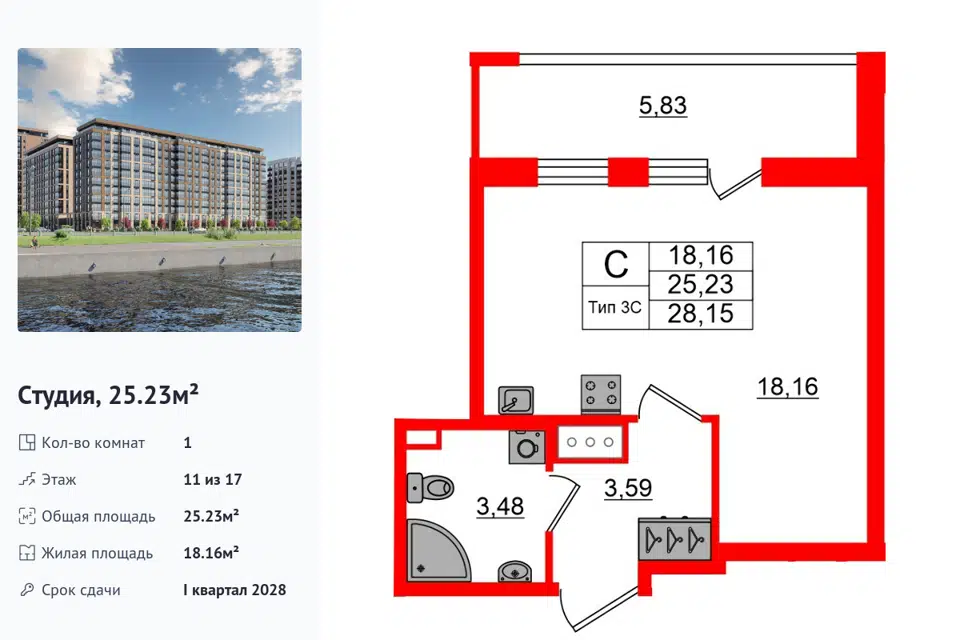 Студия, 25.23 м², 11/19 этаж