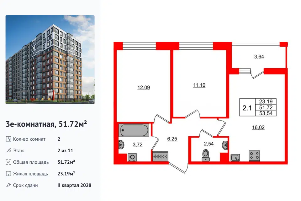 2-комн. кв., 51.72 м², 2/14 этаж