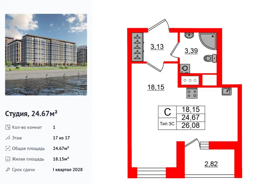 Студия, 24.67 м², 17/19 этаж