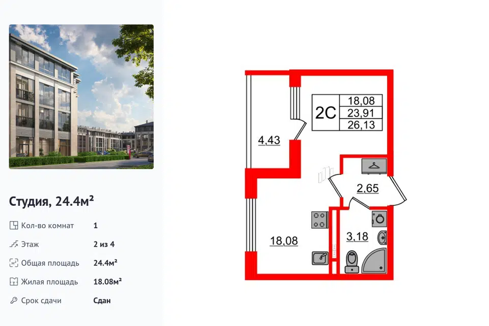Студия, 24.4 м², 2/1 этаж