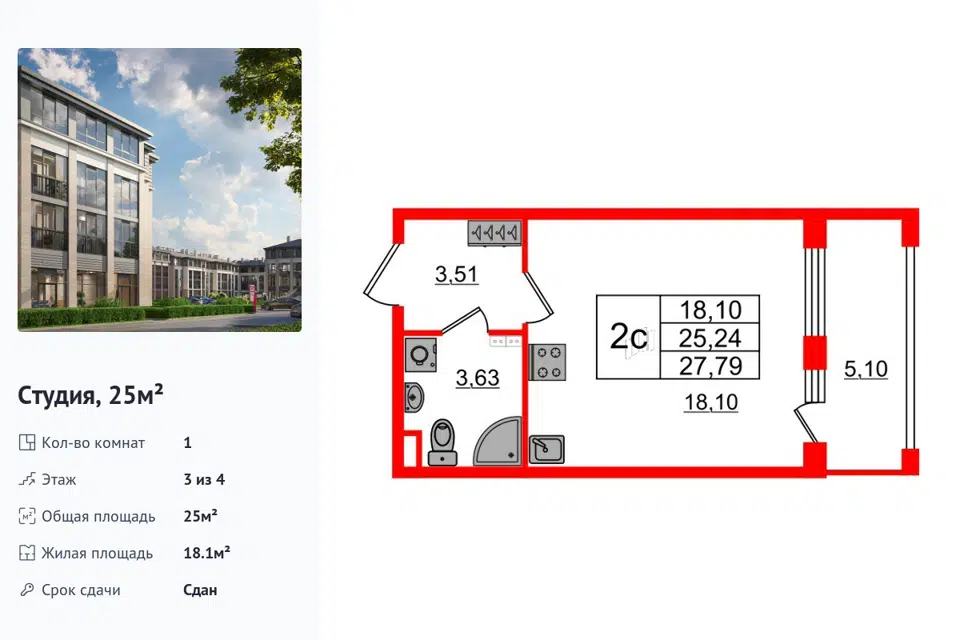 Студия, 24.09 м², 3/4 этаж