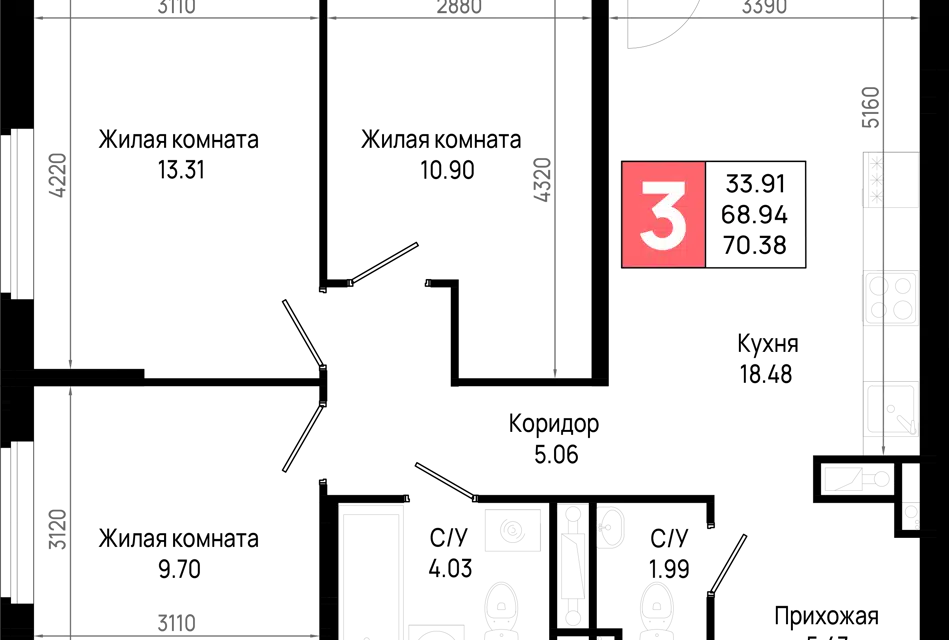 3-комн. кв., 70.38 м², 2/22 этаж
