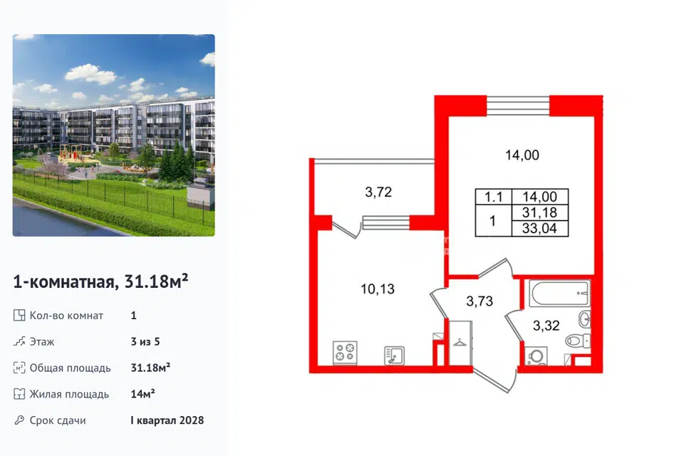 1-комн. кв., 31.18 м², 3/1 этаж