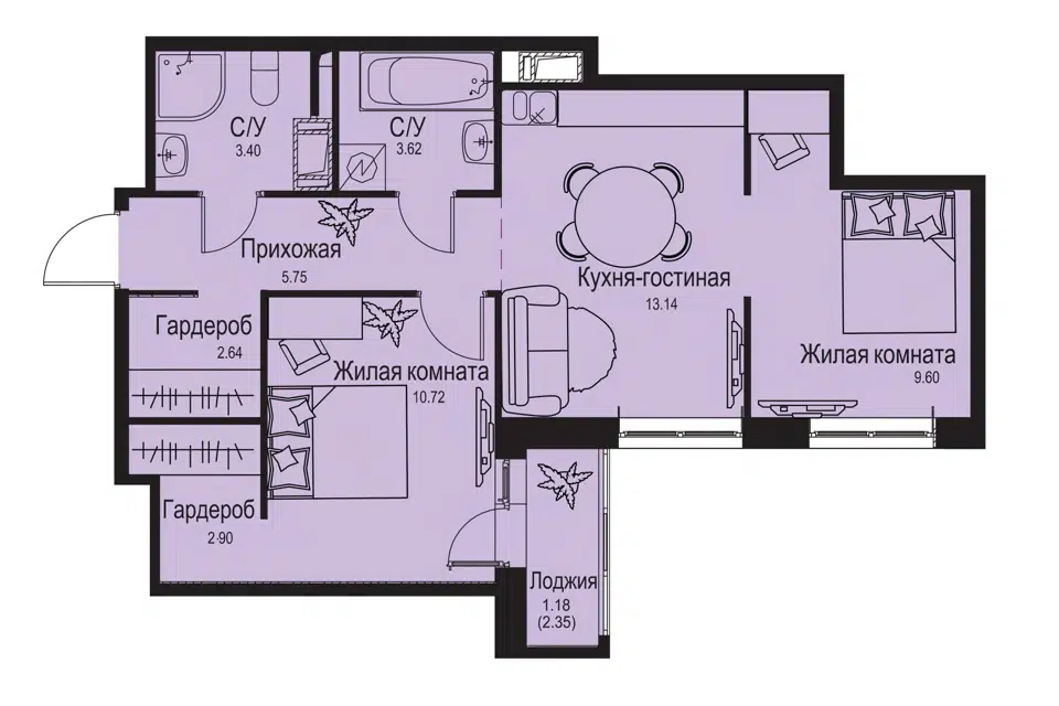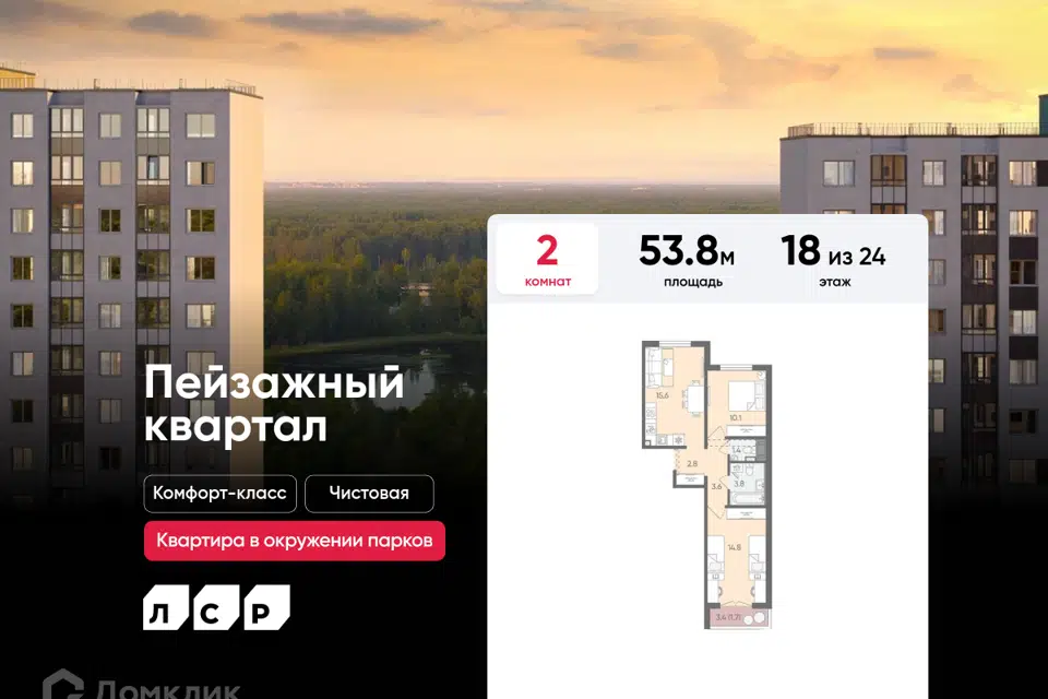 2-комн. кв., 53.8 м², 13/24 этаж