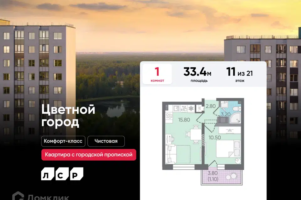 1-комн. кв., 33.4 м², 6/21 этаж