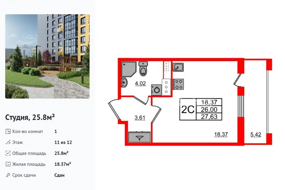 Студия, 25.8 м², 9/12 этаж