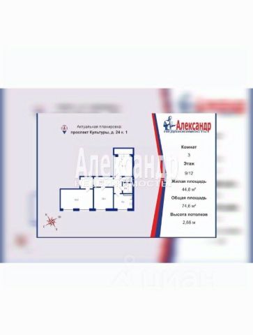 3-комн. кв., 74.6 м², 9/12 этаж