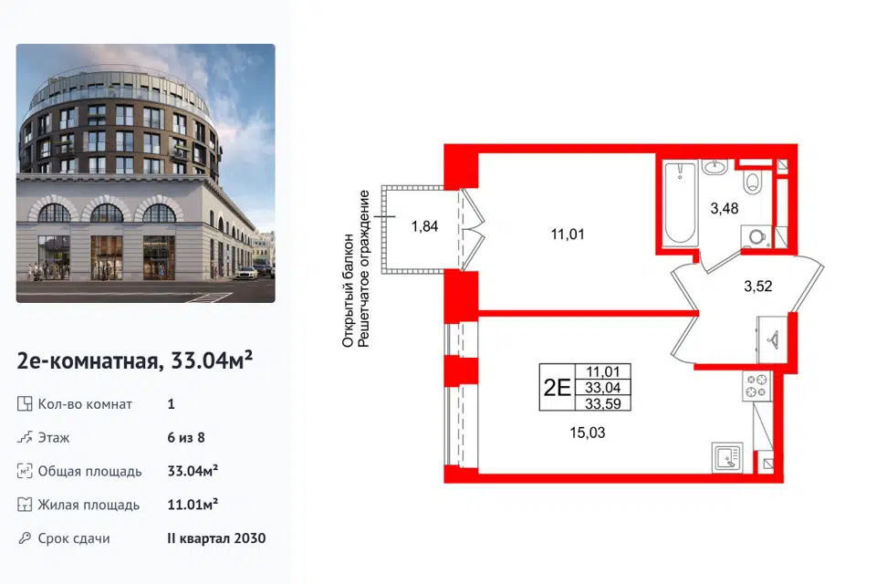 1-комн. кв., 33.04 м², 6/1 этаж