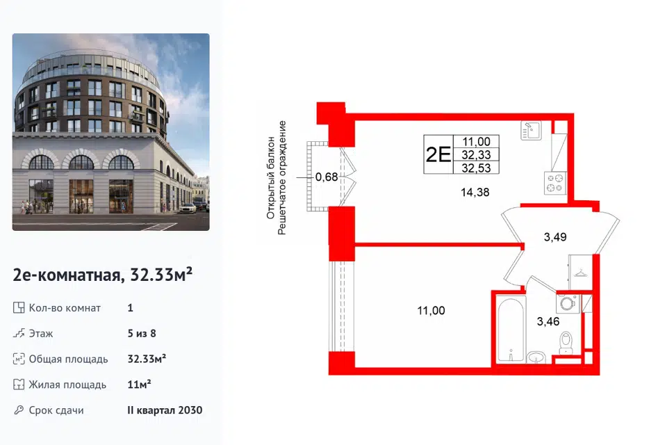 1-комн. кв., 32.33 м², 5/1 этаж