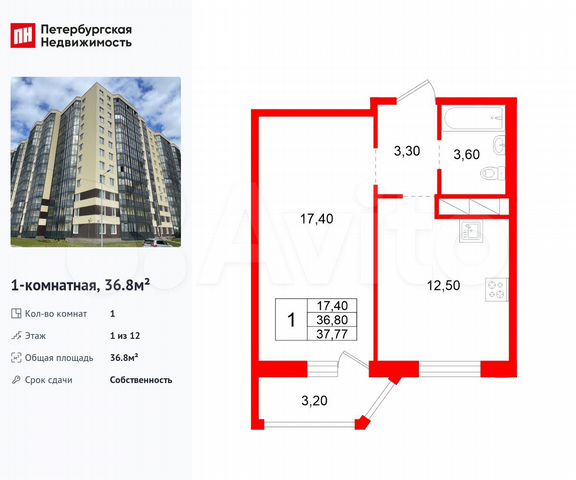 1-комн. кв., 36.8 м², 1/12 этаж
