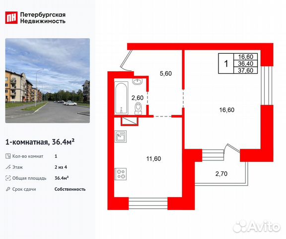 1-комн. кв., 36.4 м², 2/4 этаж