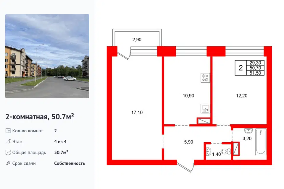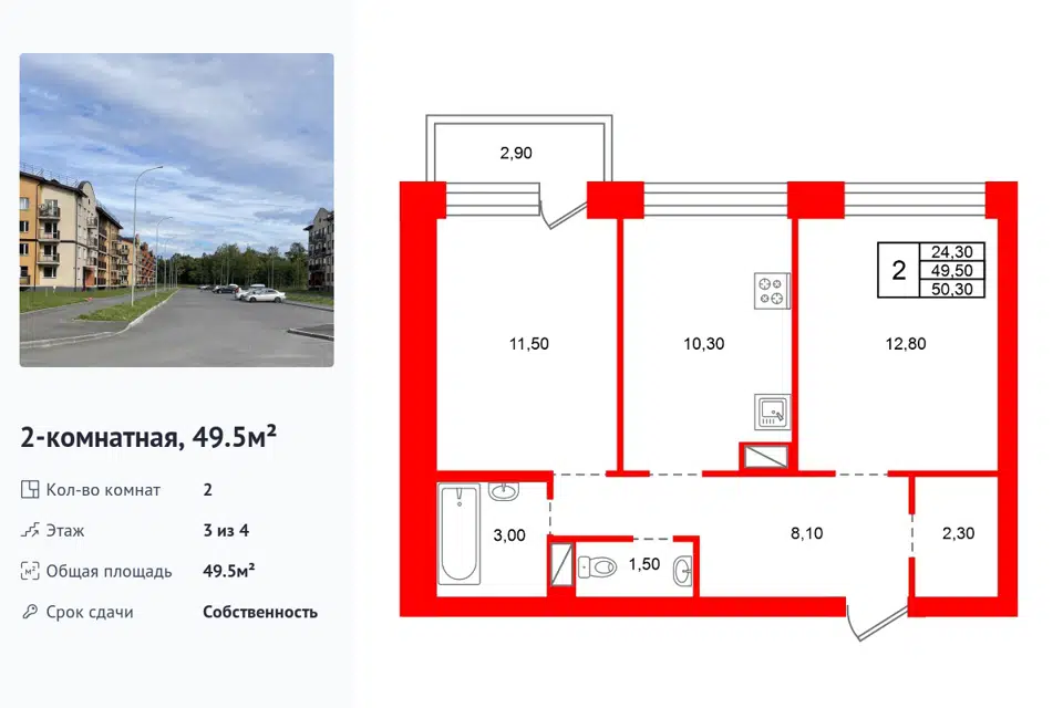 2-комн. кв., 44.9 м², 1/2 этаж