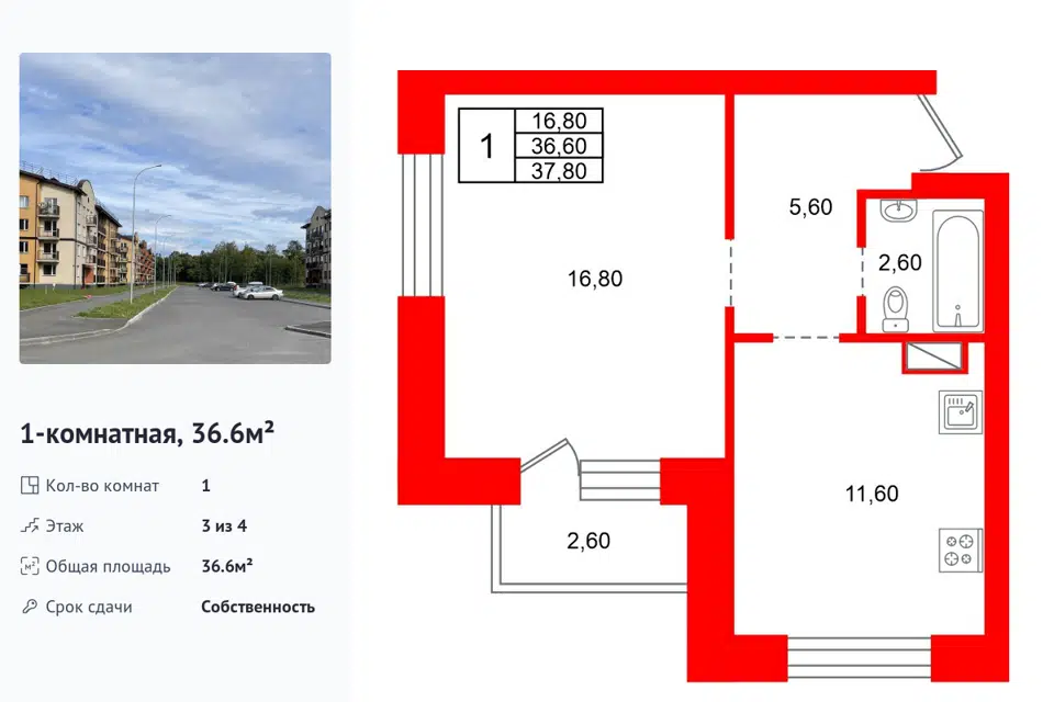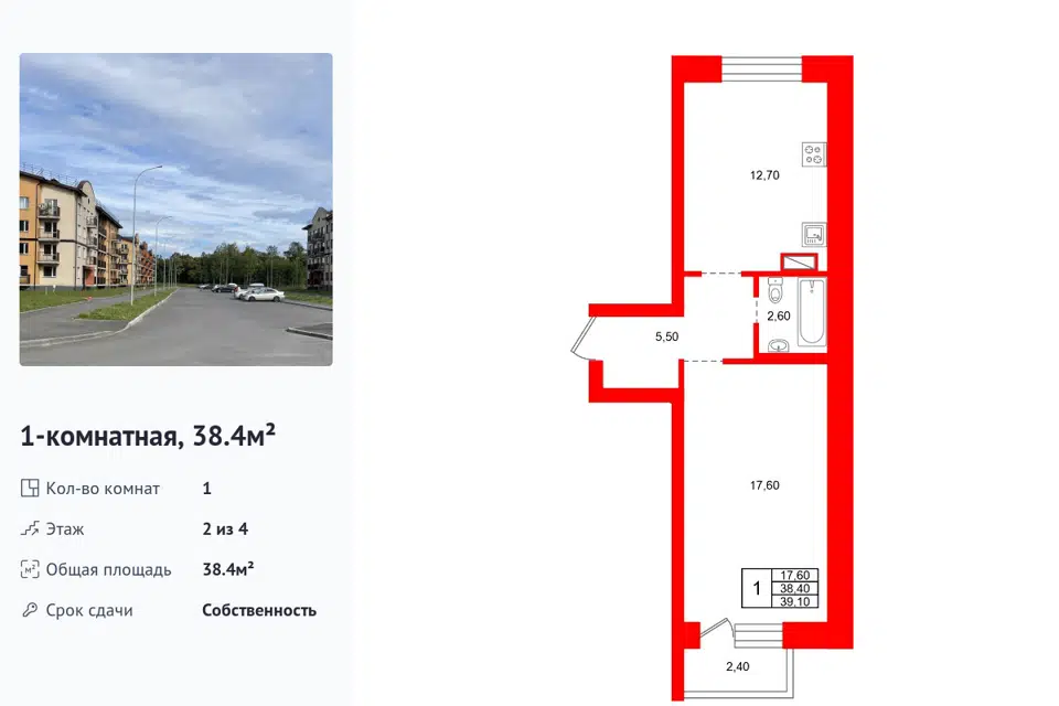 1-комн. кв., 32.2 м², 1/2 этаж