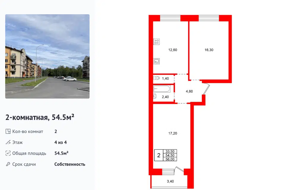 2-комн. кв., 57.8 м², 6/6 этаж