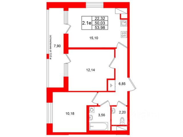 2-комн. кв., 50.5 м², 12/15 этаж