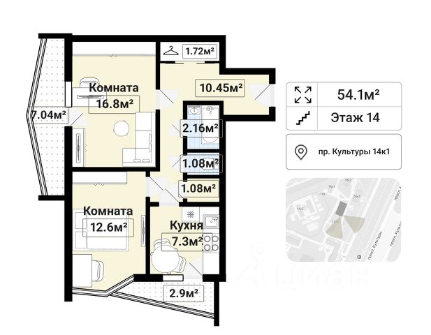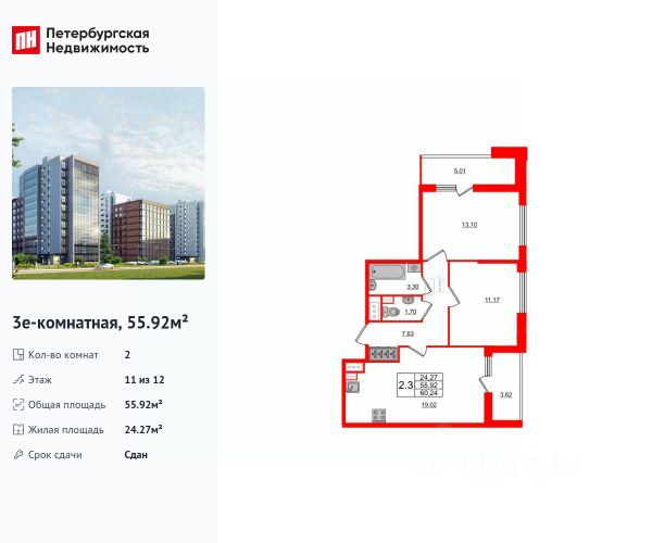 2-комн. кв., 55.92 м², 11/12 этаж