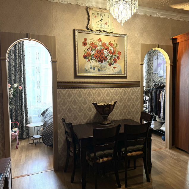 В квартире шесть комнат, что позволяет комфортно разместиться большой семье или использовать пространство для различных нужд. Кухня площадью 12 квадратных метров станет отличным местом для семейных ужинов. Из окон открывается вид как на тихую улицу, так и во двор. Для вашего удобства предусмотрены один совмещенный и один отдельный санузел. Имеется прачечная.