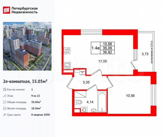 1-комн. кв., 35.1 м², 9/22 этаж