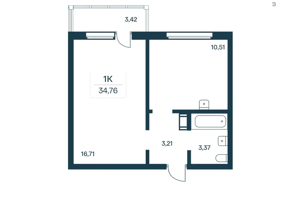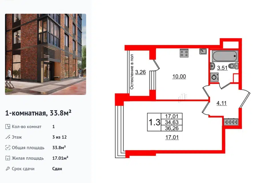1-комн. кв., 31.1 м², 3/13 этаж
