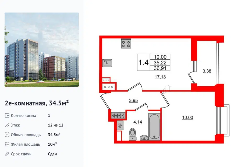 1-комн. кв., 34.5 м², 12/1 этаж