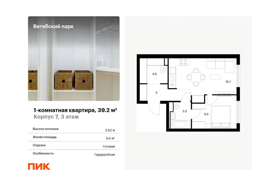 1-комн. кв., 39.2 м², 7/12 этаж