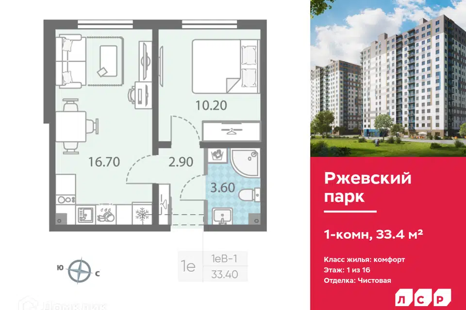 1-комн. кв., 33.4 м², 5/16 этаж