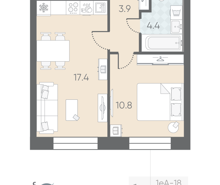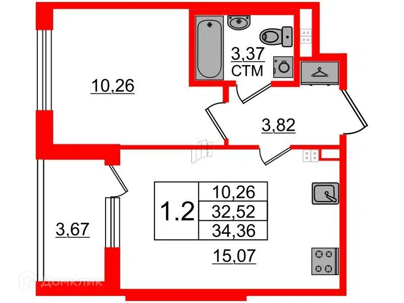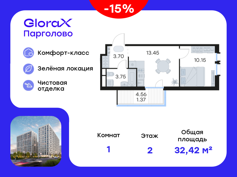 1-комн. кв., 32.42 м², 10/15 этаж