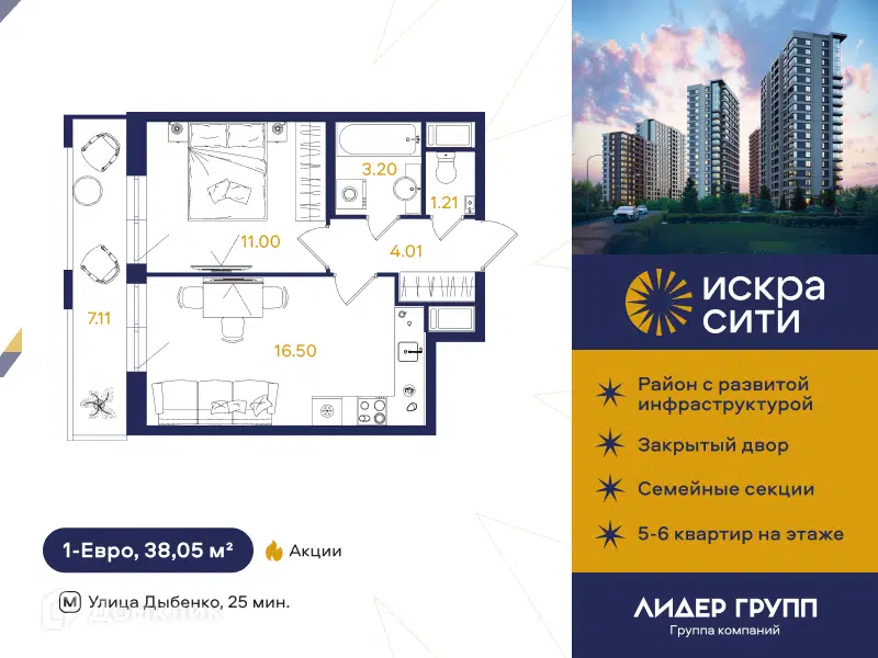 1-комн. кв., от 33.61 м², 6-11 этажи
