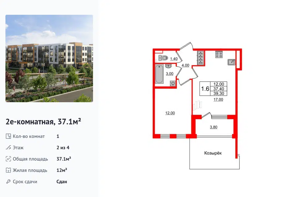 1-комн. кв., от 34.04 м², 1-4 этажи