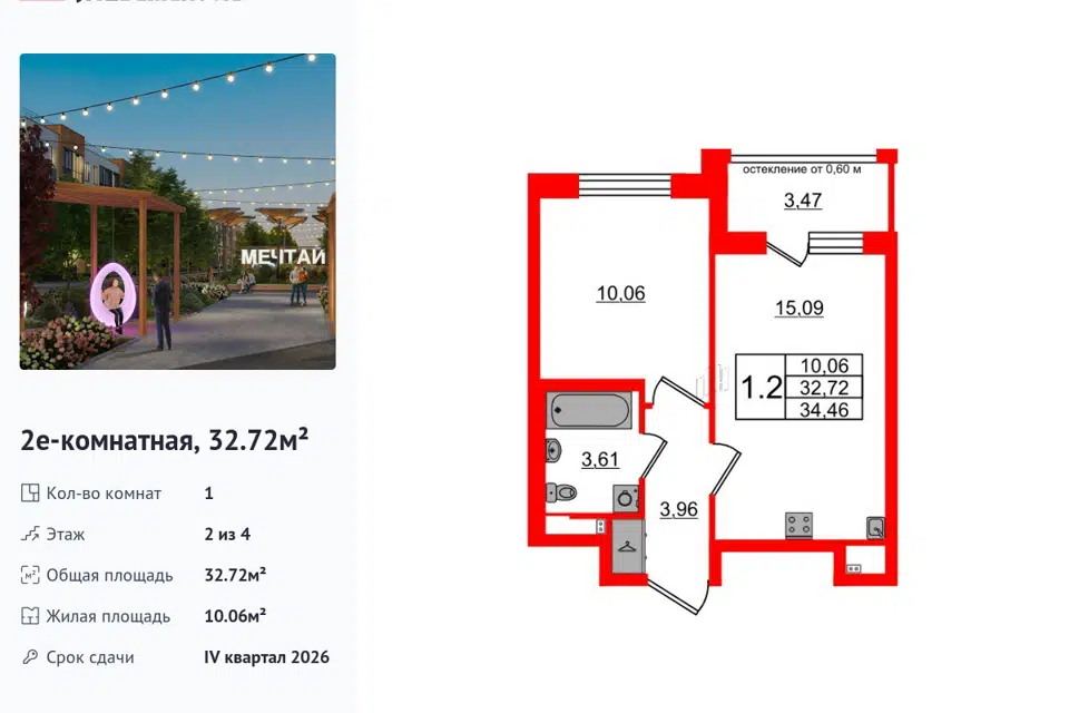 1-комн. кв., от 32.23 м², 1-4 этажи
