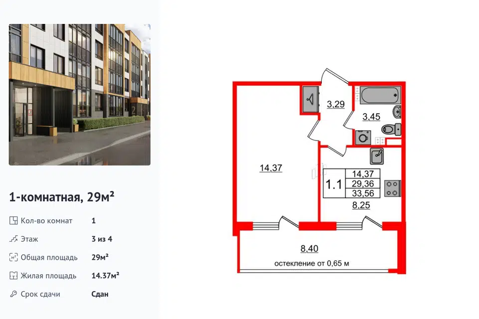 1-комн. кв., от 33.67 м², 1-4 этажи