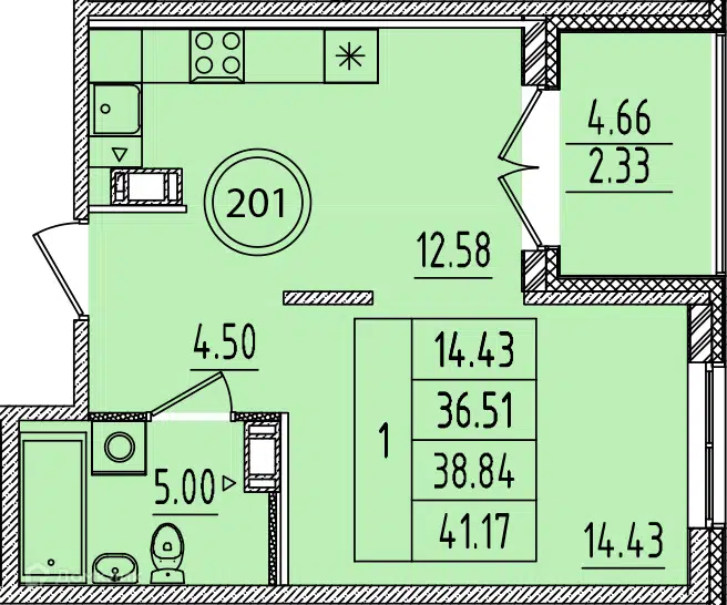 1-комн. кв., 41.7 м², 1/5 этаж