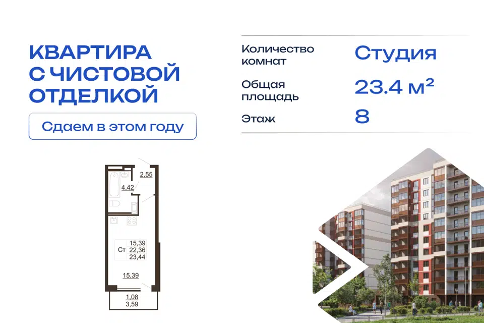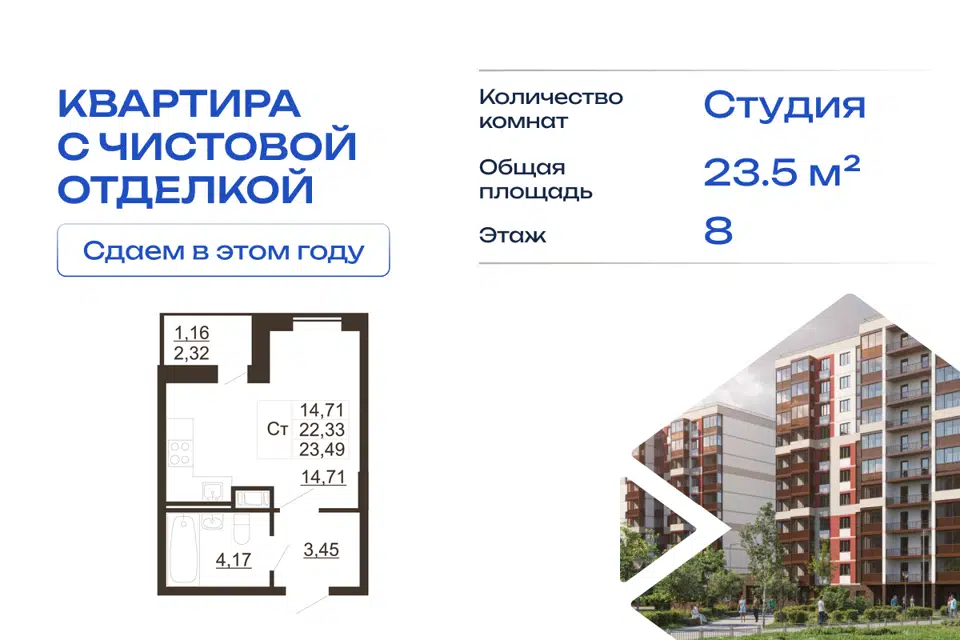 Студия, 23.1 м², 8/11 этаж