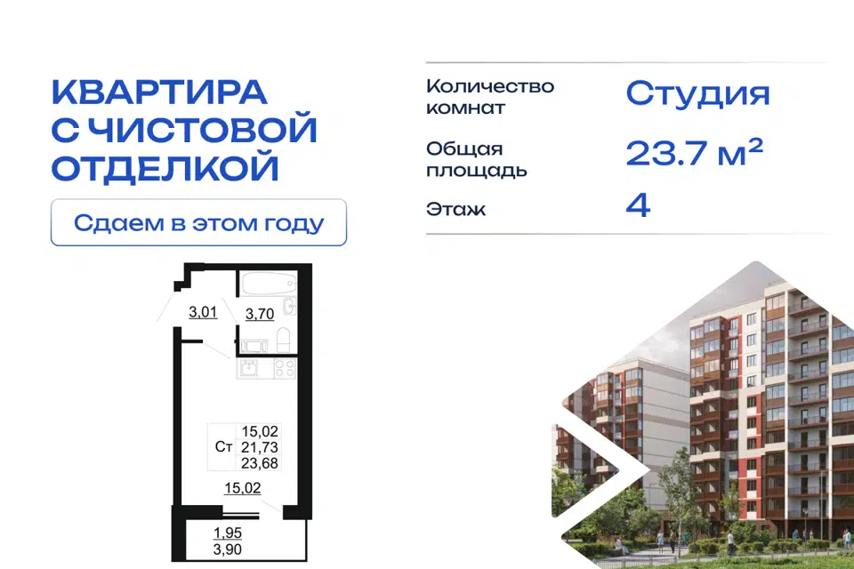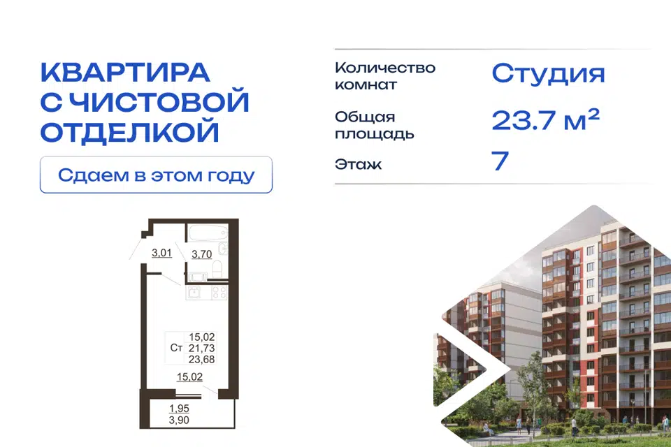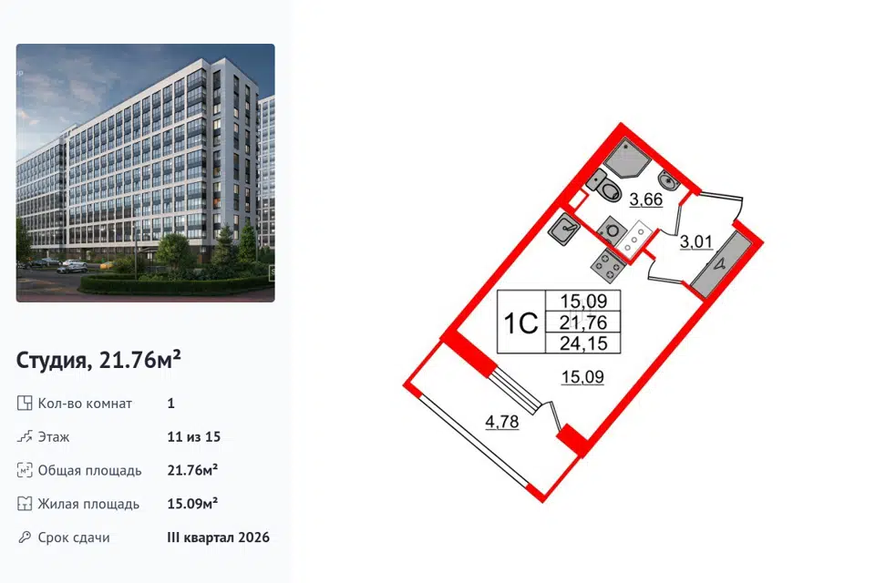 Студия, 21.76 м², 11/15 этаж