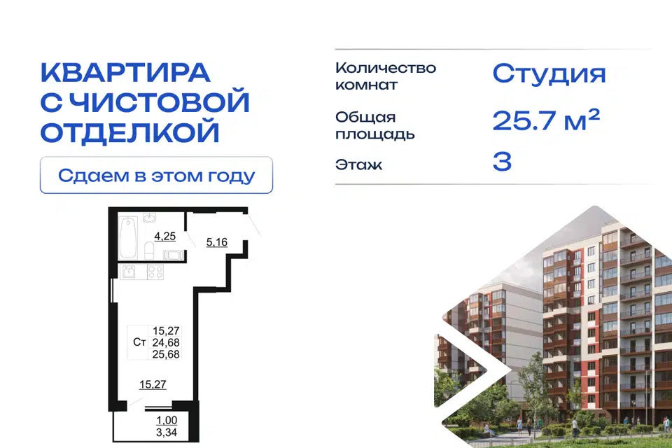 Студия, 25.5 м², 3/11 этаж