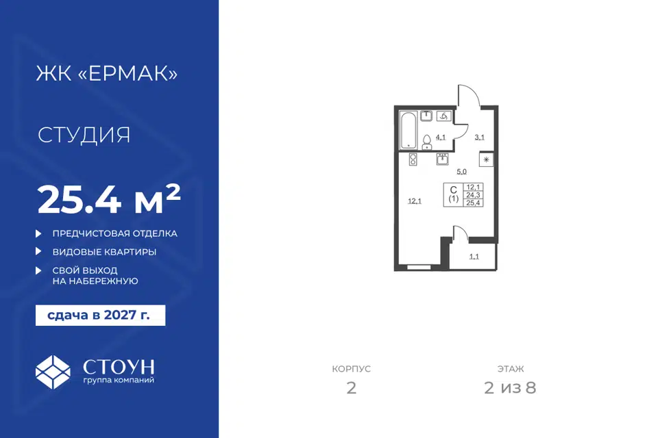 Студия, 25.4 м², 1/8 этаж