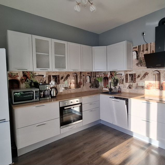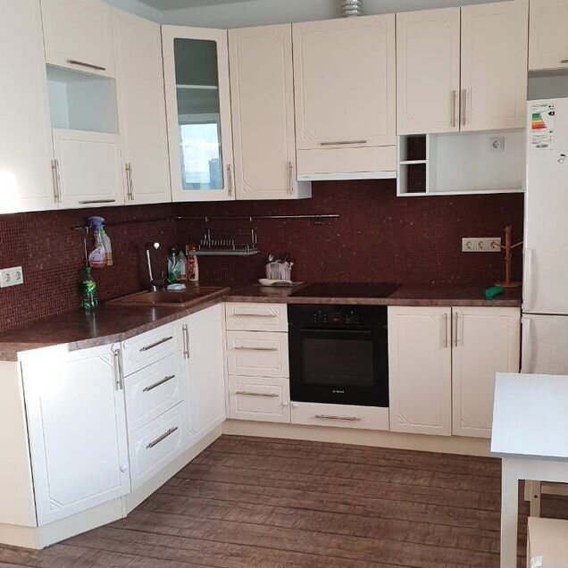 В кухне встроен духовой шкаф Bosch, индукционная варочная поверхность Electrolux, вытяжка Elica, холодильник LG самый тихий в своем роде, что смогли найти и стиральная машинка LG вместимостью на 6кг.
