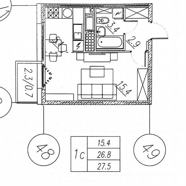 Удобная ванная комната с прекрасной отделкой. Жилая комната почти квадратной формы, что в совокупности с высокими потолками 2,74 м создает ощущение полноценной однокомнатной квартиры.