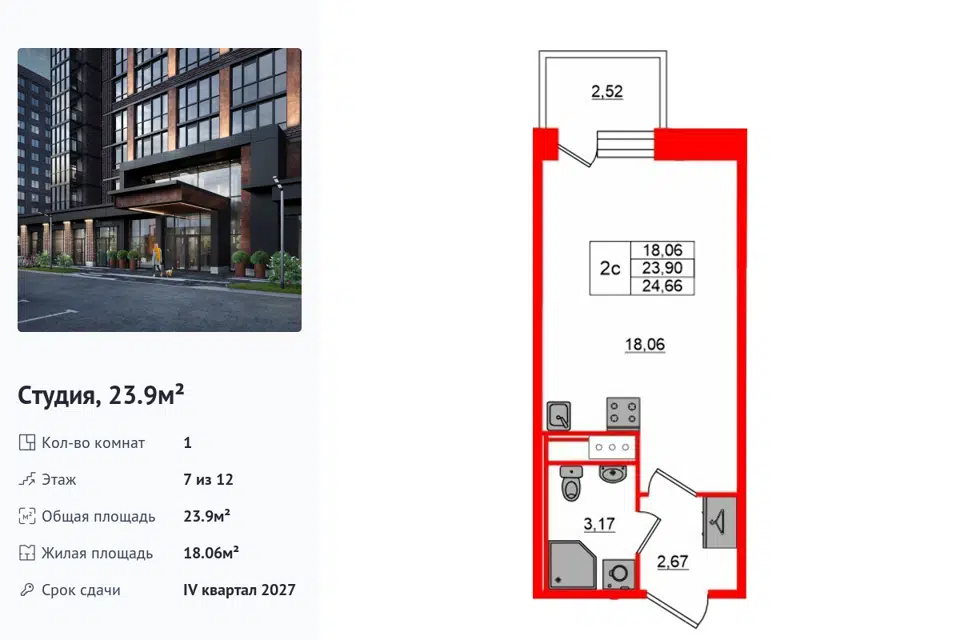 Студия, 26.6 м², 7/18 этаж