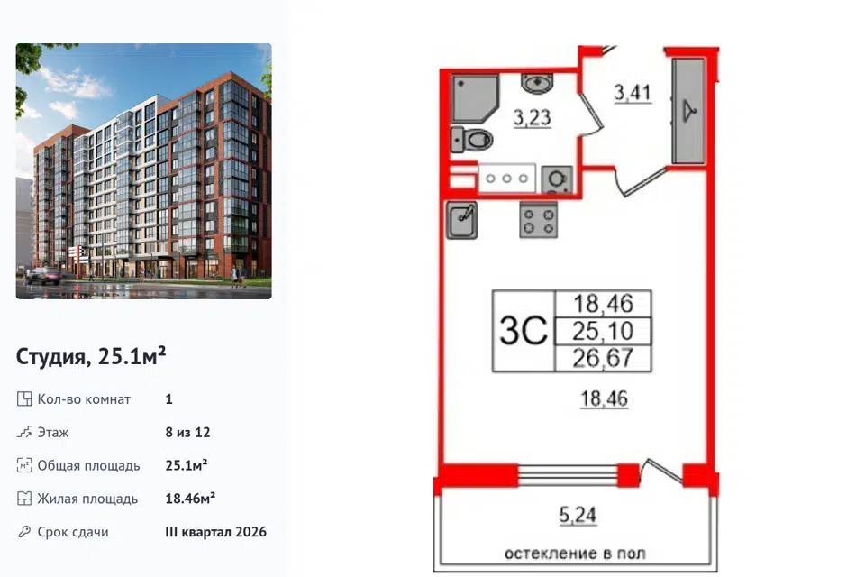 Студия, 25.1 м², 8/12 этаж