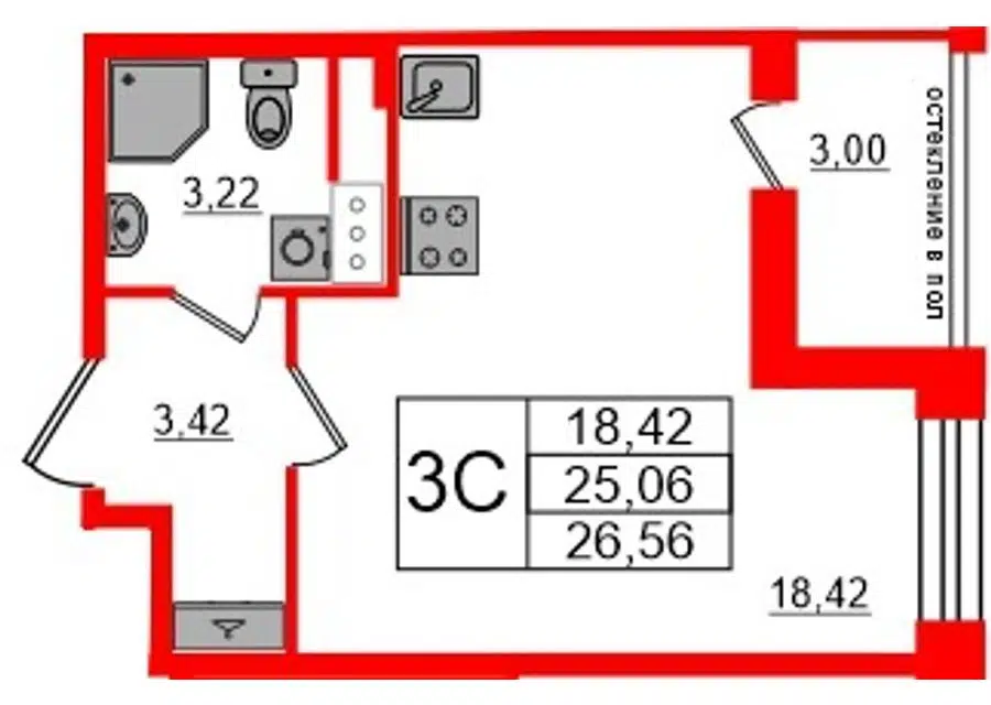 Студия, 25.1 м², 13/17 этаж