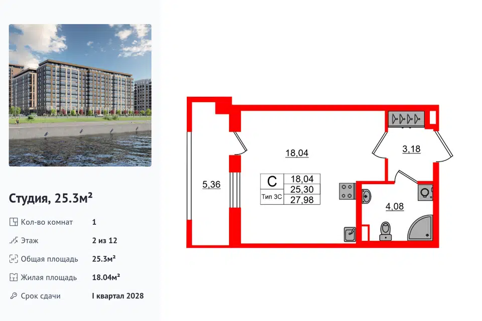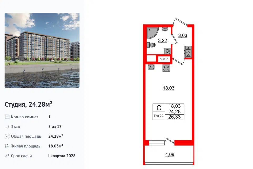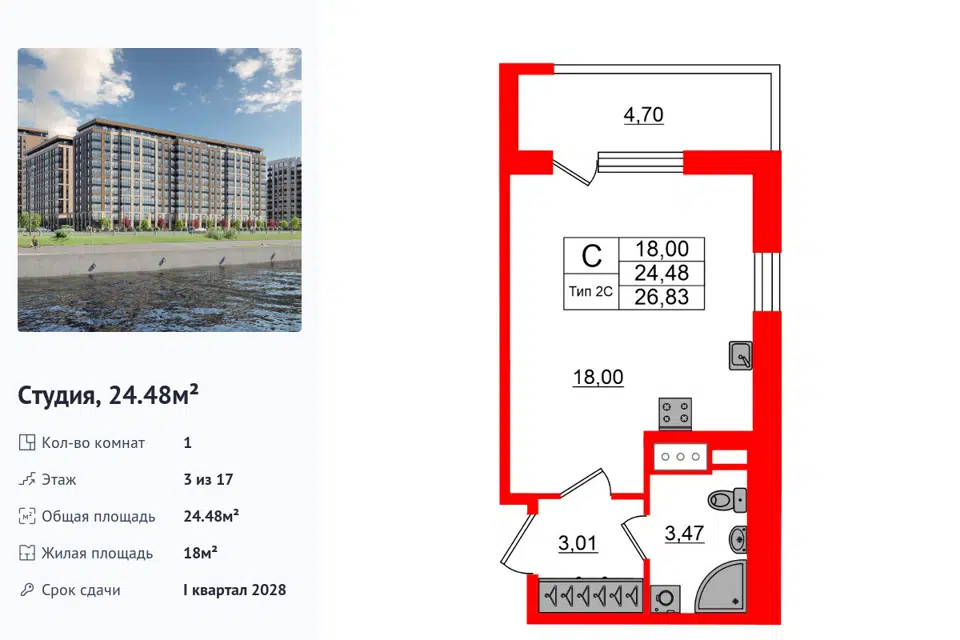 Студия, 24.48 м², 12/18 этаж