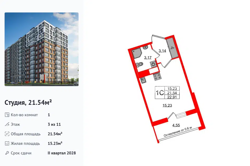 Студия, 21.54 м², 3/14 этаж