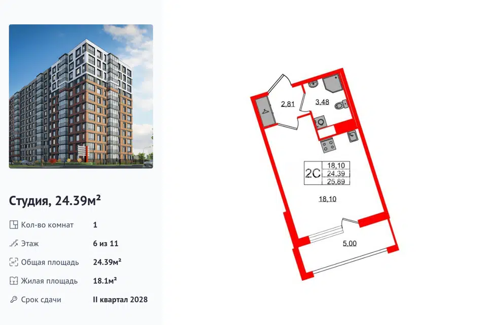Студия, 28 м², 2/25 этаж