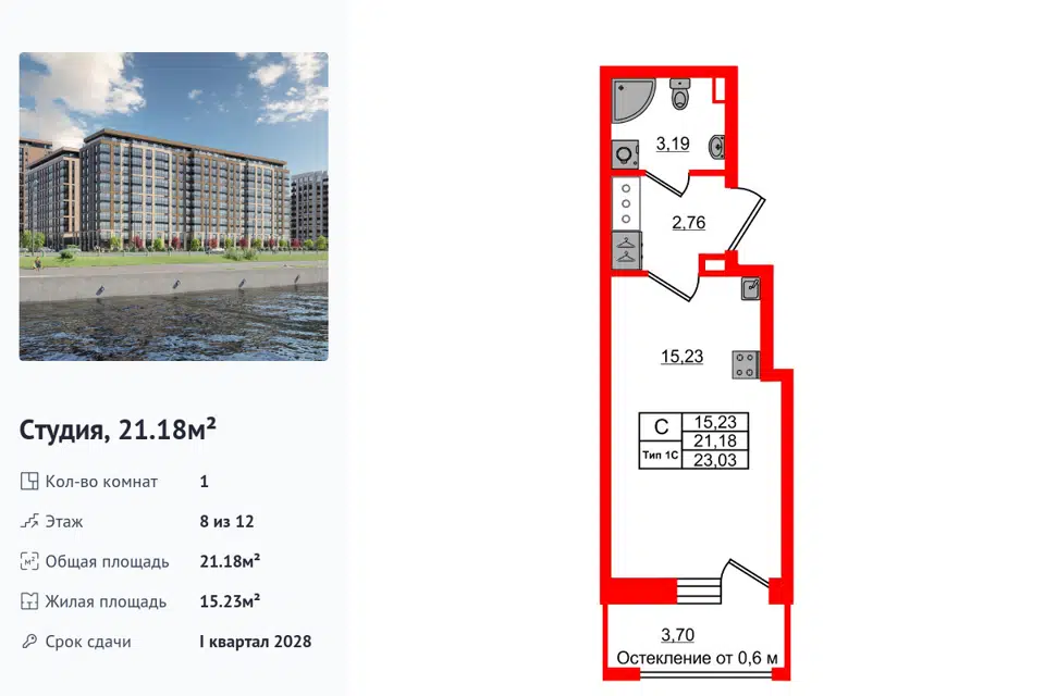 Студия, 21.18 м², 8/14 этаж