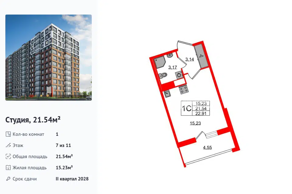 Студия, 21.54 м², 7/14 этаж
