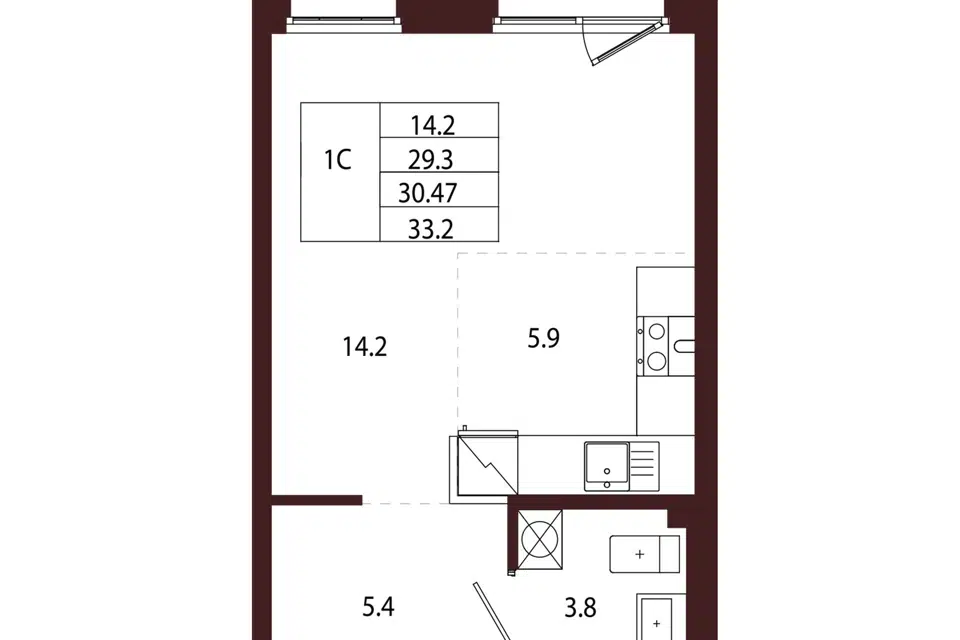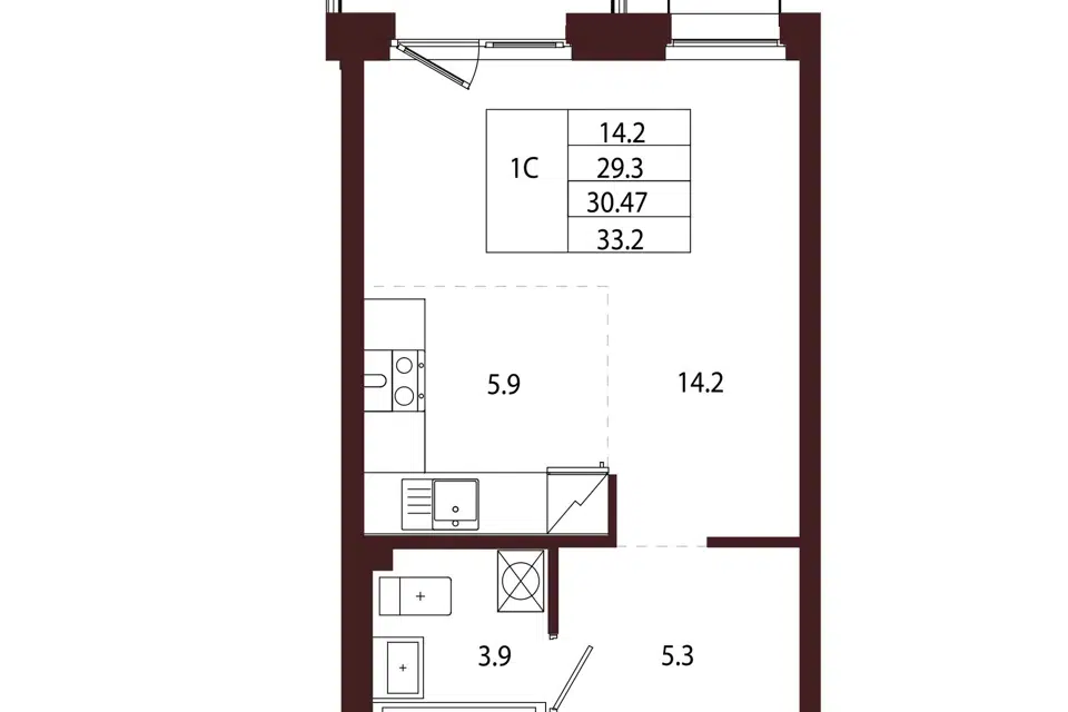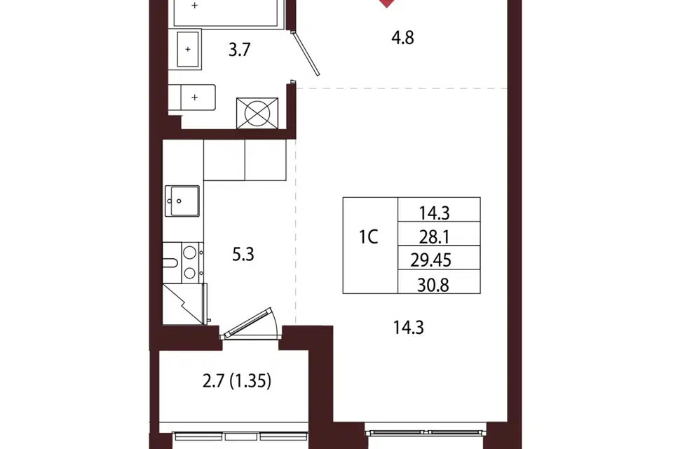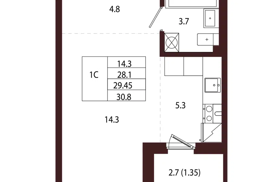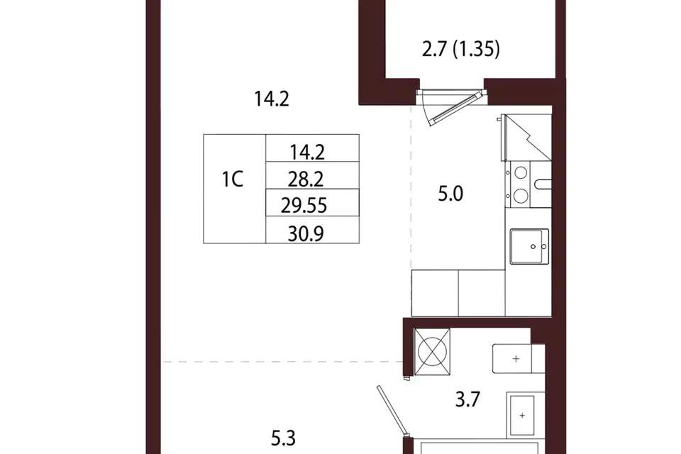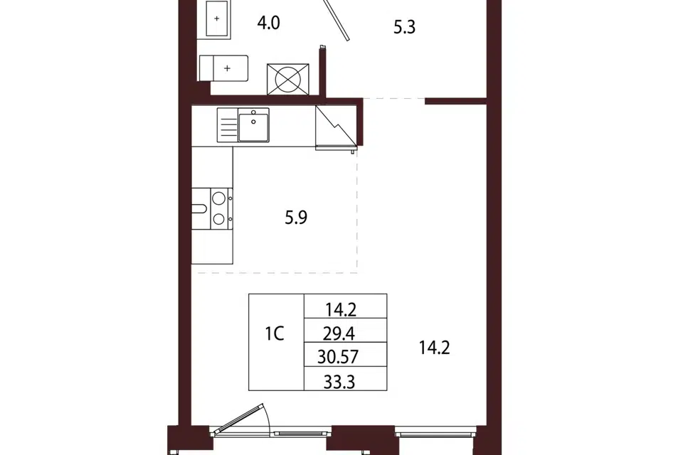 Студия, 30.57 м², 3/5 этаж