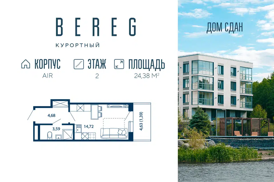 Студия, 24.38 м², 2/5 этаж