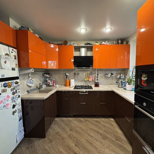 - кухня оборудована бытовой техникой Bosh: индукционная варочная панель, посудомойка, духовой шкаф; мощная вытяжка на 1200 куб. От Maunfeld; микроволновка; холодильник LG.